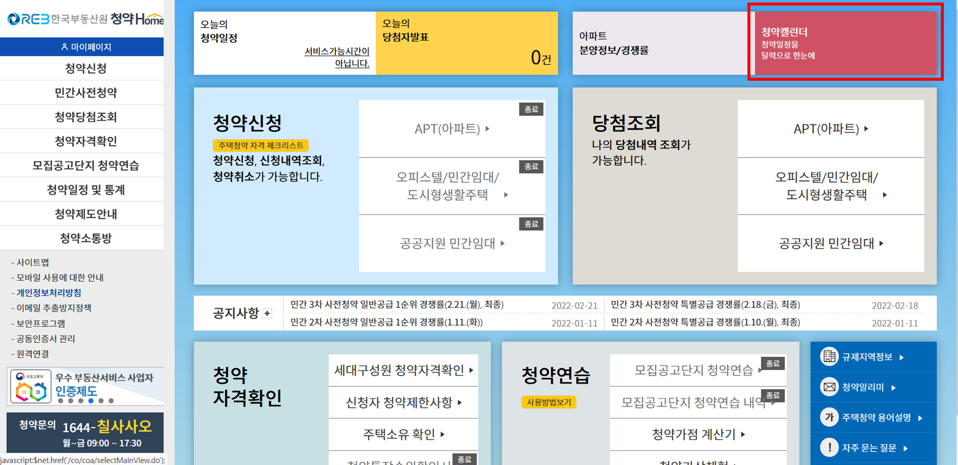 2) 우측 상단에 있는 청약캘린더를 클릭합니다.