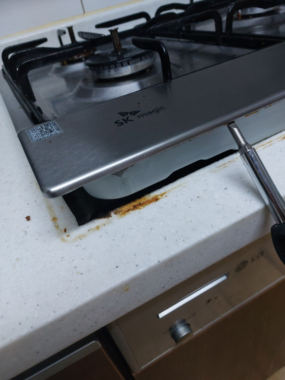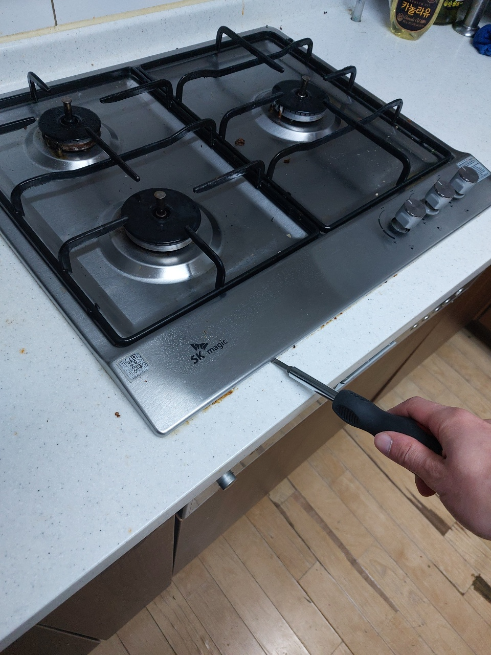 먼저 위 사진처럼 일자 드라이버를 이용해 가스레인지 홈 부분에 찔러넣습니다. 그리고 살짝 힘을 주어 들어올려줍니다.