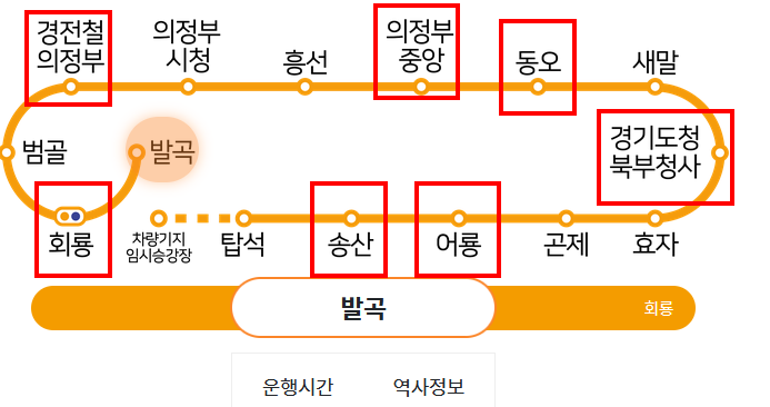 | 회룡역 | 동오역 | 송산역 | 경기도청북부청사역 | 의정부중앙역 | 경전철의정부역 | 어룡역 |