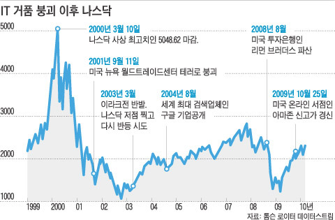 대표적인 버블이 바로 2000년 초에 있었던 나스닥 닷컴 버블입니다. 이때문에 2000년 초 당시 국내증시도 IT관련 기업의 주가가 폭등했다가 폭락한 사례가 많습니다. 많은 기업들이 파산하기도 했구요.