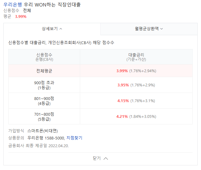 신용대출 금리정보를 비교해보면 4% 수준이군요. 우리은행 신용대출을 자세히 보겠습니다.