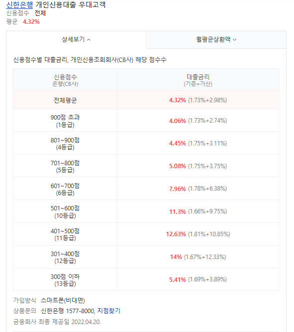 신한은행은 등급별로 대출금리가 더 잘 분류되어 있습니다. 400점대는 대출금리가 15% 가까이 되네요.