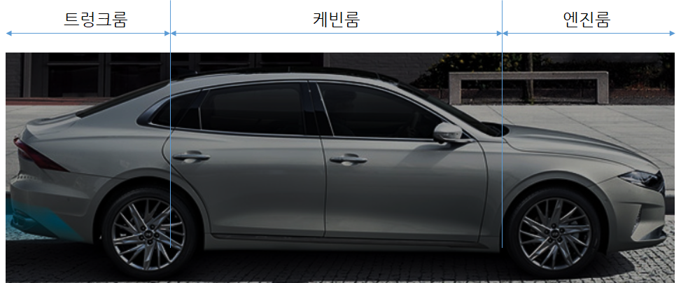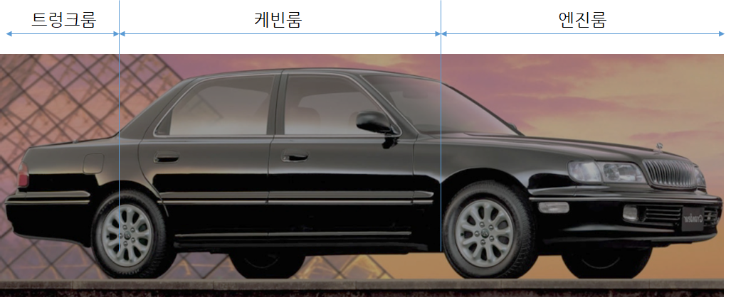 1992년에 출시된 2세대 그랜저의 측면 사진을 보자. 최신 그랜저보다 트렁크룸, 케빈룸, 엔진룸이 더욱 확실히 구분된다. 이는 세단의 디자인 변화때문이다.