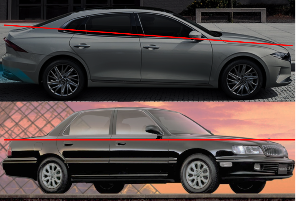 2세대 그랜저(1992년 출시)의 경우 차체 라인이 평행하다. 하지만 신형 그랜저의 경우 차체 라인이 앞으로 기울어져 있다. 다시말해서 엔진룸의 높이와 트렁크룸의 높이차이가 생겼다.