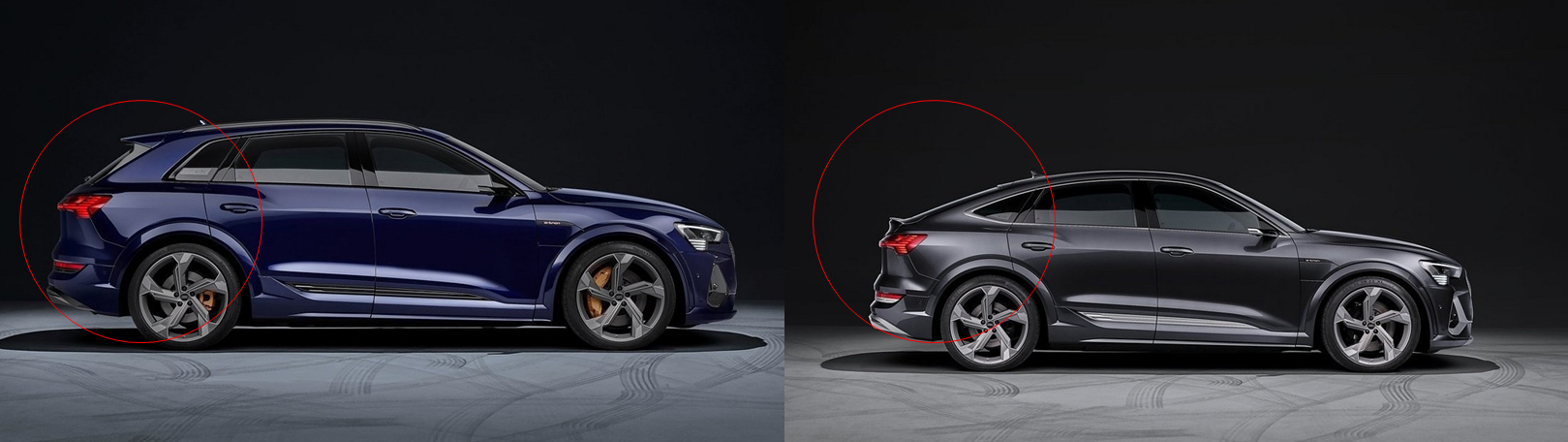 이렇게 보니 차이가 꽤 보이죠? 좌측이 일반 SUV인 e-트론 S, 우측이 쿠페형 SUV e-트론 S 스포트백입니다.
