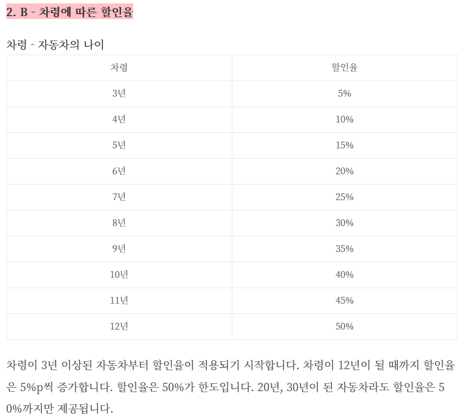 위 표에 따라 차령이 5년일 경우 할인율은 15%이므로 28,500원 × (1- 0.15) = 24,225원 입니다.