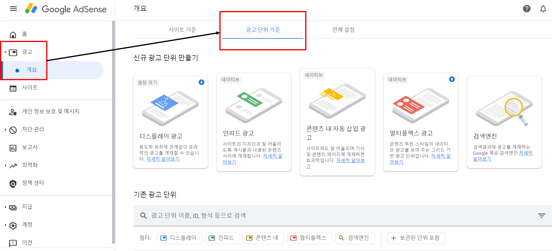 그리고 애드센스 홈페이지에 접속하여 광고 - 광고 단위 기준 순으로 클릭합니다.