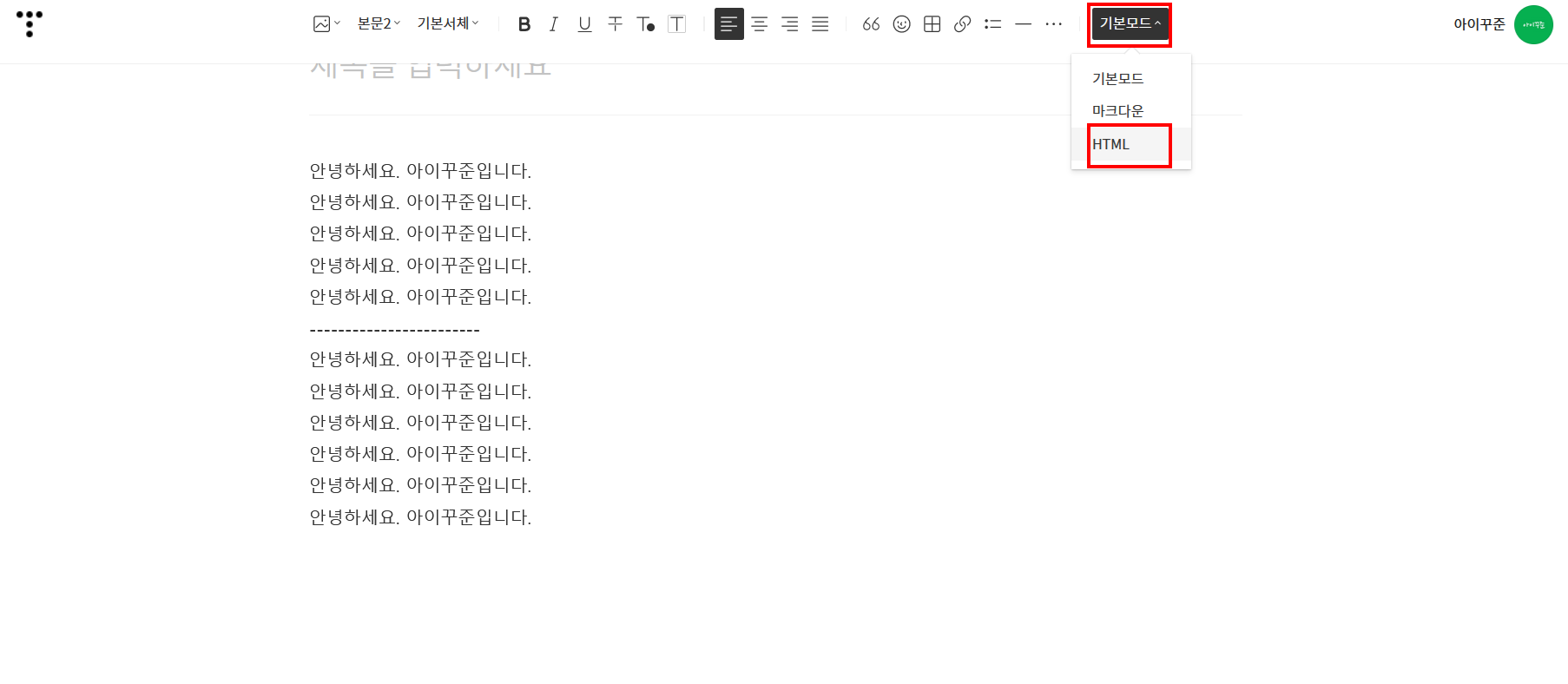 코드 복사 후 티스토리 블로그로 돌아옵니다. 그리고 화면 상단의 기본모드 - HTML을 클릭합니다.