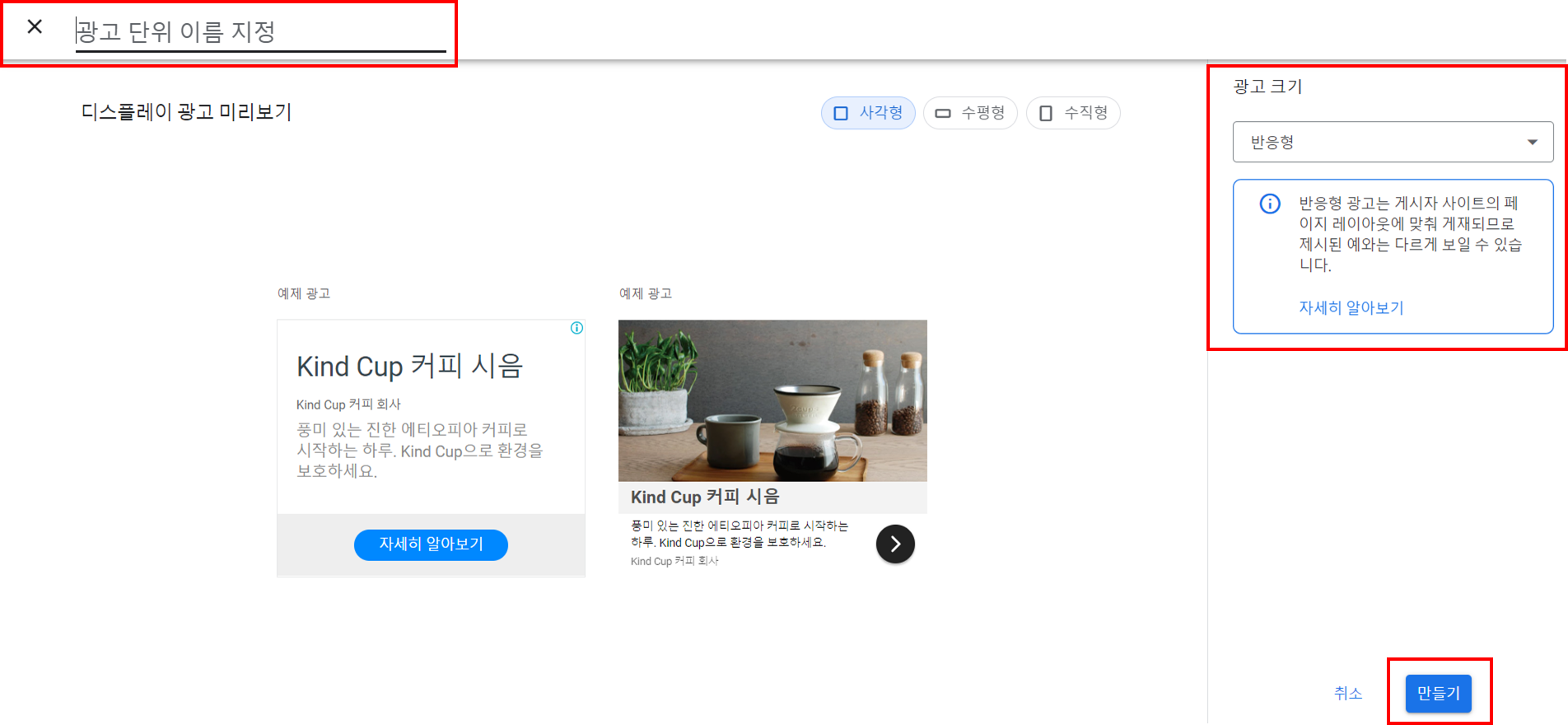 그러면 아래와 같은 화면이 나타나는데요. 광고 단위 이름은 내가 원하는 대로 정해주면 됩니다. 그리고 광고 크기는 가급적 반응형을 추천드립니다. 그리고 만들기를 클릭하세요.