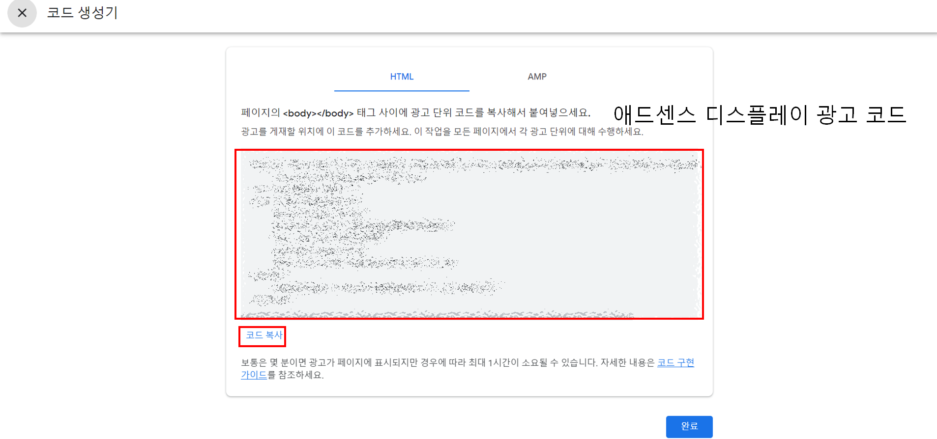 만들기를 누르면 아래와 같은 화면이 나타납니다. 빨간 상자로 강조표시를 한 곳이 애드센스 디스플레이 광고 코드입니다. 아래 코드 복사를 클릭해줍니다.