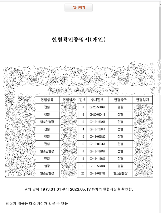 본인인증까지 완료하면 이렇게 헌혈확인증명서를 발급할 수 있습니다.