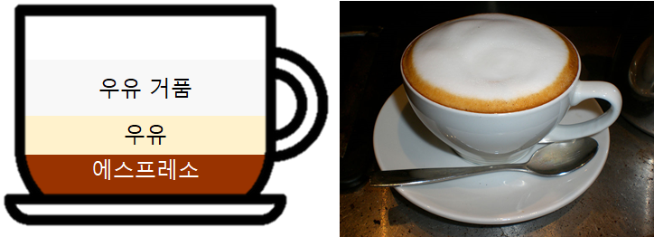 이탈리아에서 개발된 커피로, 에스프레소에 우유를 붓고, 그 위에 우유 거품을 올립니다.