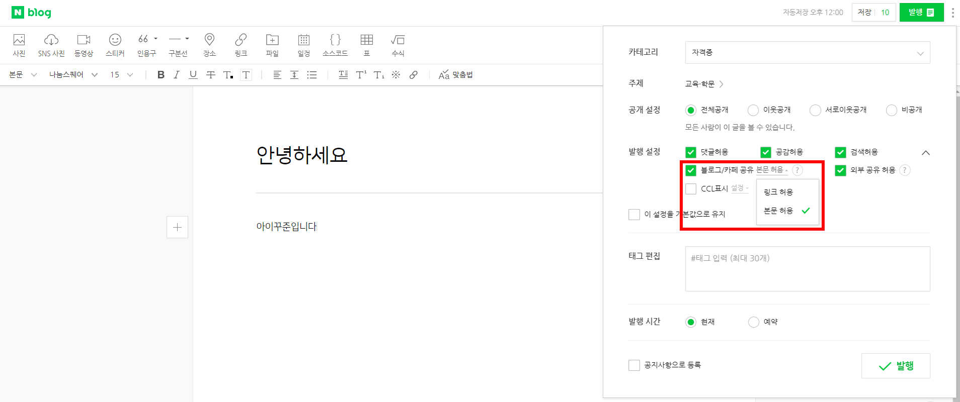 블로그 글쓰기 화면에서 발행을 누르시면 작은 창이 뜹니다. 거기서 제가 빨간색 박스로 강조한 부분인블로그/카페 공유 버튼입니다. 이게 클릭이 되어있어야하고 링크 허용에서 본문 허용으로 바꿔주어야 합니다.