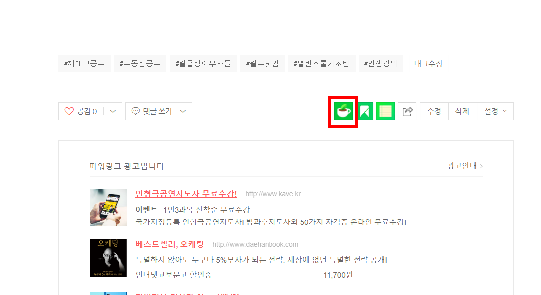 바로 위 사진에 있는 카페 버튼입니다. 블로그 글을 내리다보면 저런 버튼이 있는 걸 보실 수 있습니다. 물론 내 블로그에서만 보입니다.