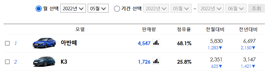 2022년 5월 기준 준중형 세단 판매량의 경우 아반떼가 4,547대로 기아 K3 판매량의 약 2.5배 수준입니다.
