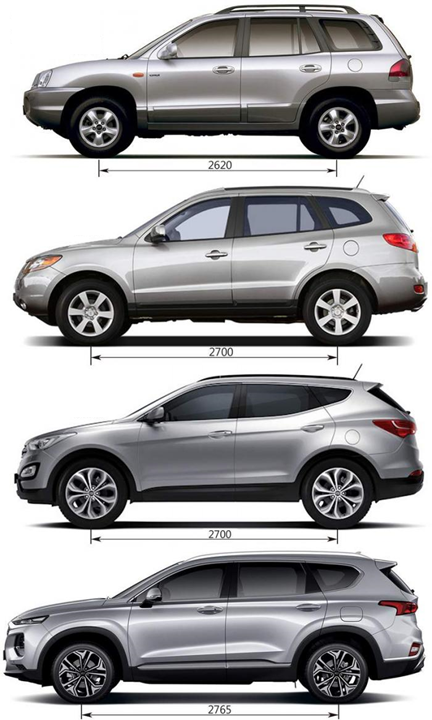 위 사진은 현대 중형 SUV인 싼타페의 축간거리가 어떻게 달라지는지 나타냅니다.