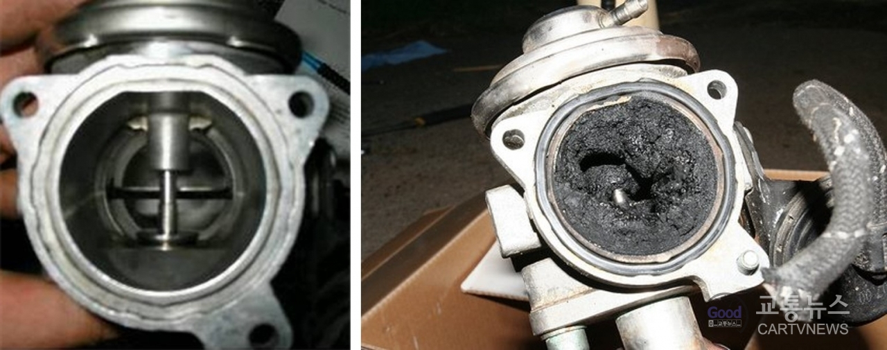 이렇게 배기가스 찌꺼기가 EGR 밸브에 덕지덕지 달라붙게 되면 외부에서 들어오는 흡기공기량이 매우 줄어 들게 됩니다.