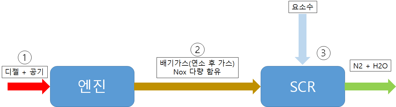 이를 요소수와 촉매를 이용해 다시 질소 상태로 되돌려 놓기에 산화의 반대인 환원이라는 단어가 들어간 것입니다. ($NO_x$ > $N_2$ )