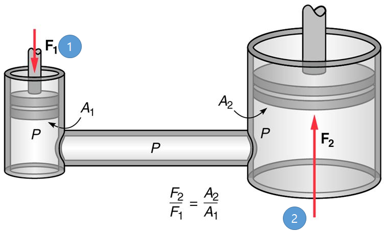 위 그림처럼 1번 피스톤 부분에 $F_1$이라는 힘이 가해지게 되면, 밀폐된 용기 내부는 압력이 작용하게 됩니다.