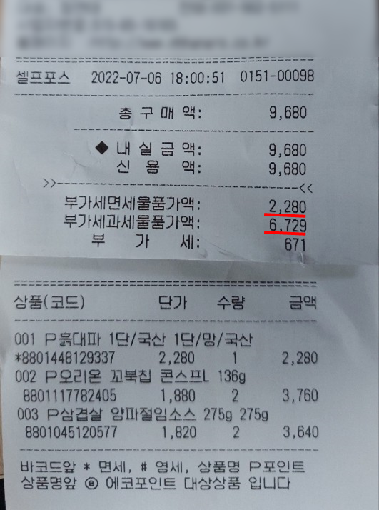 저는 일반적으로 마트나 편의점에서 구매하는 모든 물픔에 대해 부가가치세가 붙는다고 알고 있었습니다. 근데 영수증을 유심히보니 부가가치세면세, 부가가치세과세 물품이 따로 있습니다.