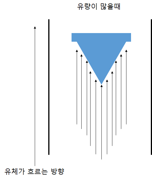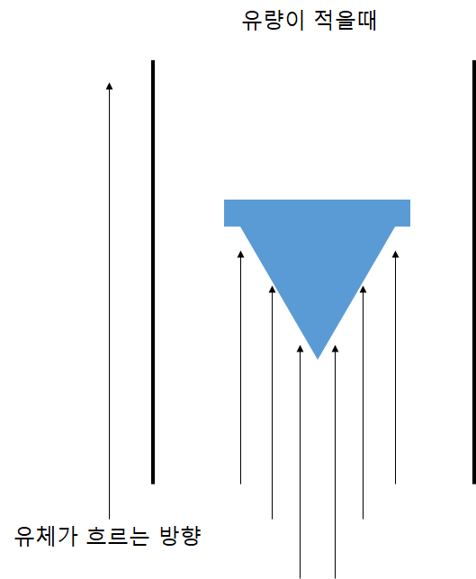 반면, 유량이 많다면 흘러가는 유체가 많으므로 부표가 받는 힘이 커지게 되어 부표가 위로 받는 힘이 증가하게 됩니다.