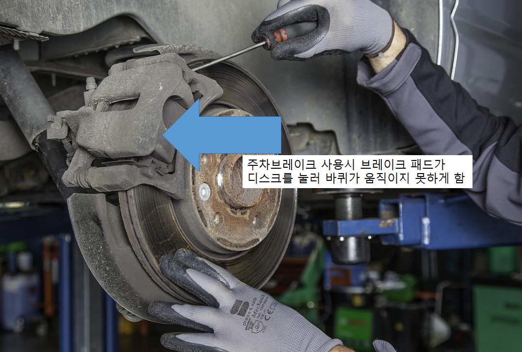 주차브레이크는 유압을 사용하지 않고 기계식으로 브레이크 패드를 강제로 움직이는 것입니다.