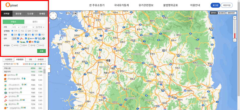5) 좌측 상단의 조회 메뉴에서 본인이 거주하는 지역과 본인이 원하는 주유소 등 기타 옵션을 클릭후 조회 버튼을 클릭합니다. 저는 서울에 살지는 않지만 서울시 강남구로 설정해서 해보겠습니다.