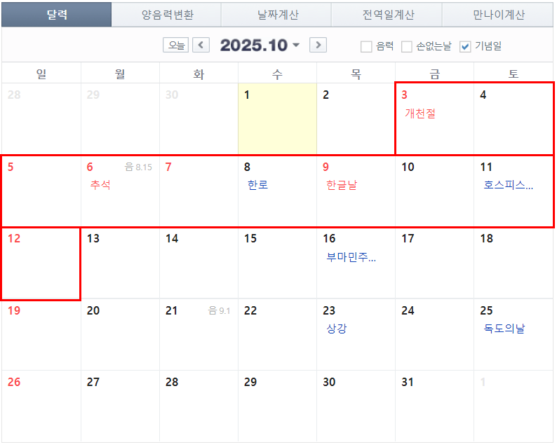 1. 2025년 10월 - 휴가 2일만 내면 10일 연휴 가능!