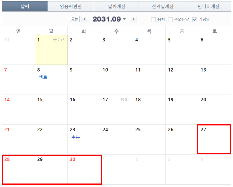 3. 2031년 9~10월 - 9/29에 휴가내면 9일간의 연휴 가능!