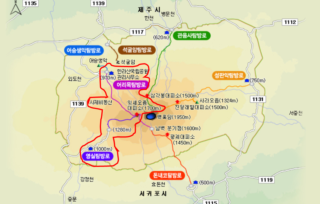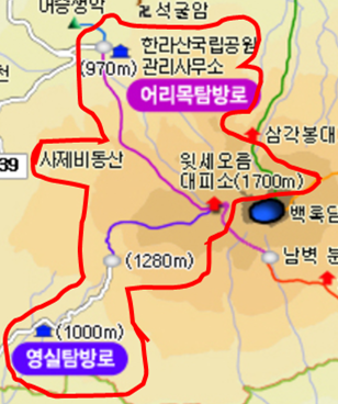 윗세오름은 어리목코스, 영실코스로 갈 수 있습니다.
