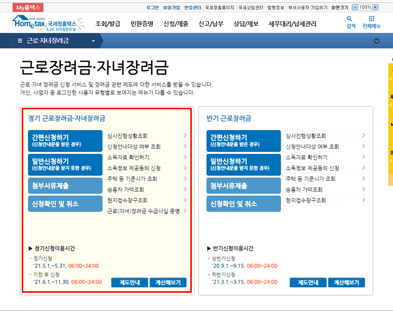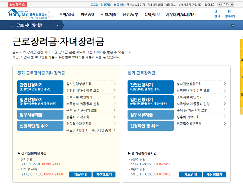 신청안내문을 받은 경우와 신청안내문을 받지 못한 경우로 나뉘는데, 본인이 해당되는 경우에 맞춰서 클릭하시면 됩니다. 참고로 우측에 반기 근로장려금은 현재 신청기간이 아닙니다. 그리고 정기 근로장려금과 조금 차이가 있으므로 나중에 따로 다뤄보겠습니다.