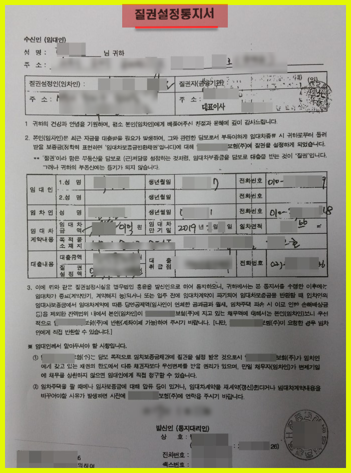 서류이름 그대로, 임대인의 집에 질권이 설정되었다는 걸 알려주는 서류입니다. 질권설정을 통해 전세자금대출을 받은 경우, 임대인은 반드시 전세보증금을 임차인이 아닌 은행(채권자)에게 제공해주어야 합니다.