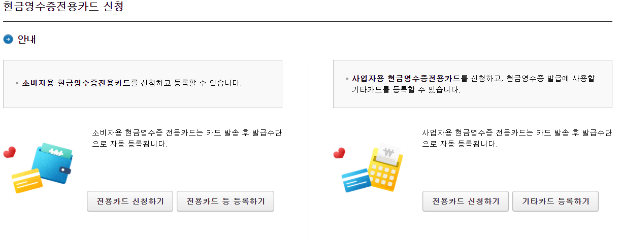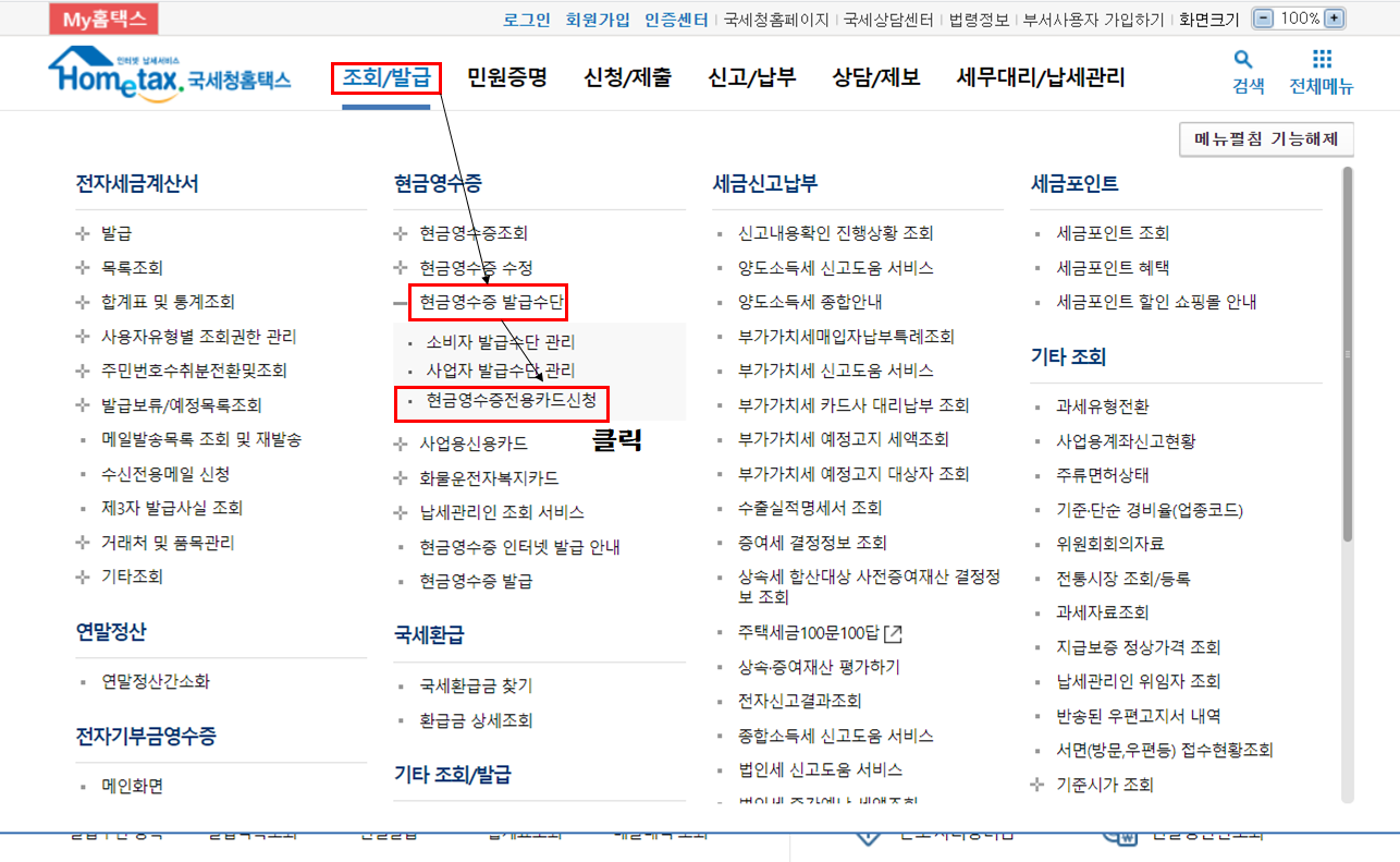 조회/발급 - 현금영수증 - 현금영수증 발급수단 - 현금영수증전용카드신청